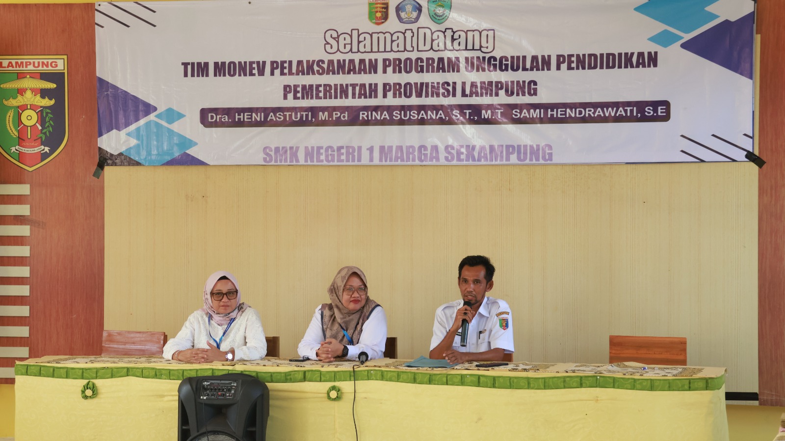 Tim Monev yang hadir terdiri dari Dra. Heni Astuti, M.Pd, Rina Susana, S.T., M.T., dan Sami Hendrawati, S.E.. Kedatangan tim disambut hangat oleh pihak sekolah, termasuk guru dan staf, di aula utama SMK Negeri 1 Marga Sekampung.